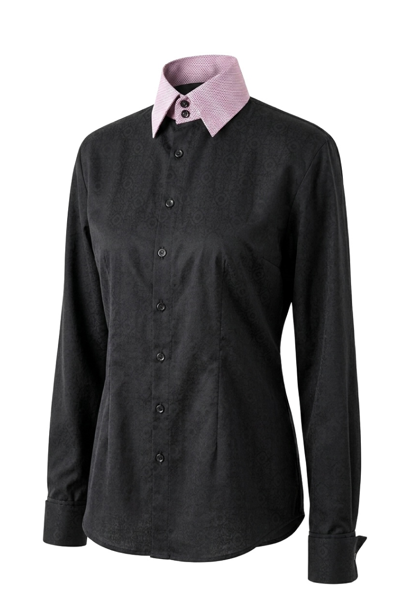 The Marbeli ACCENT 02 shirt explores the refined language of contrast and detail. A deep black base fabric with a subtle ornamental texture is complemented by a contrasting collar and cuffs, creating a sophisticated visual accent.