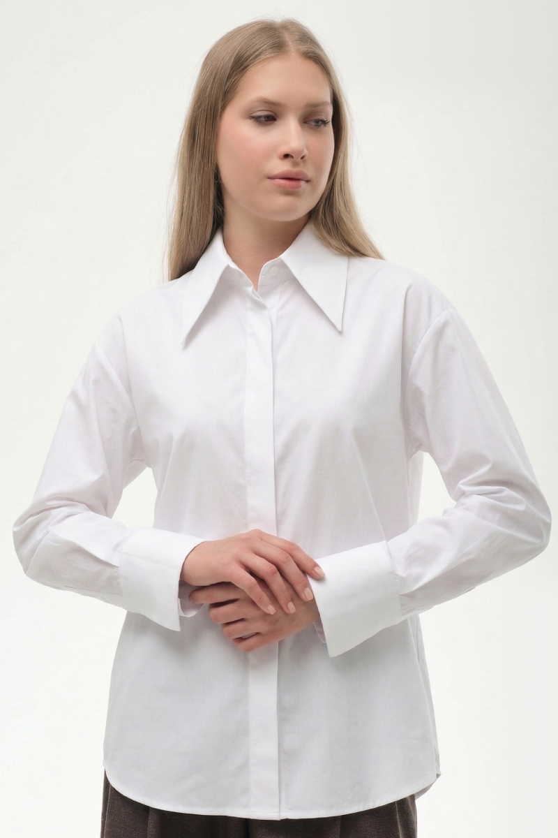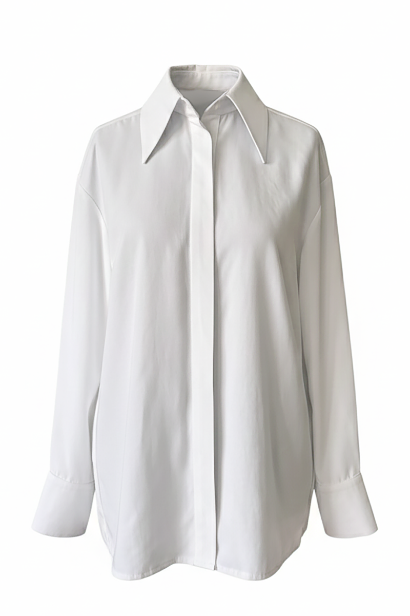 The clean white color and minimalist construction make this shirt a versatile foundation of a contemporary work wardrobe. It pairs effortlessly with tailored suits, trousers, or skirts, creating refined and modern office looks.