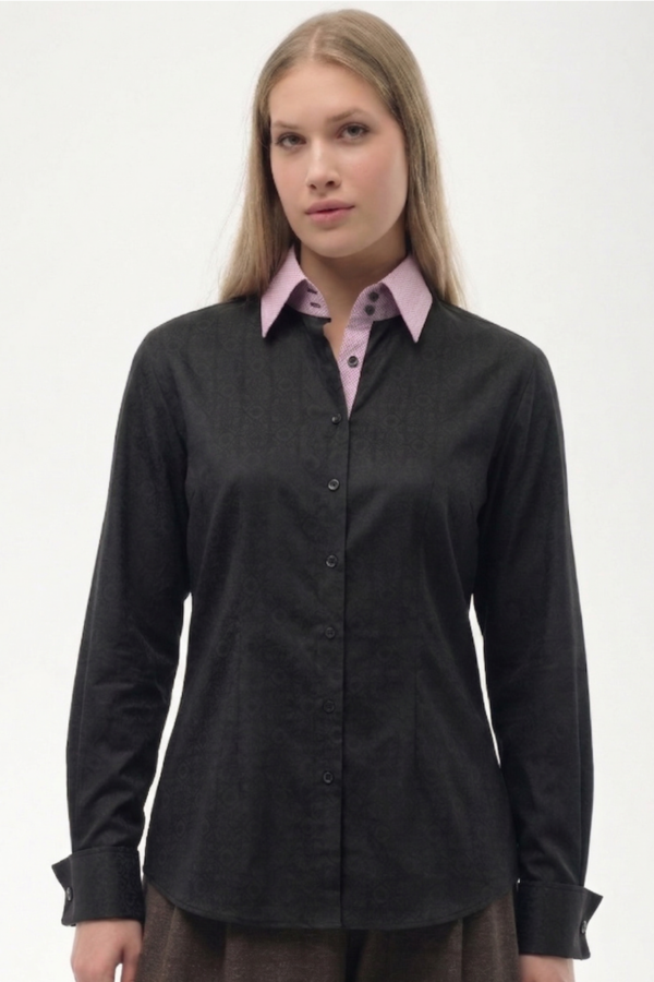 Модель виконана у напіввільному крої зі спущеною лінією плеча, що створює невимушений, збалансований образ. Асиметричний низ із подовженою спинкою додає пластичності та дозволяє легко стилізувати сорочку — як навипуск, так і заправленою.