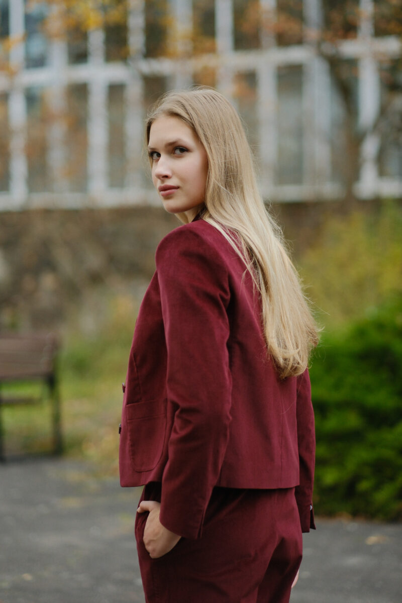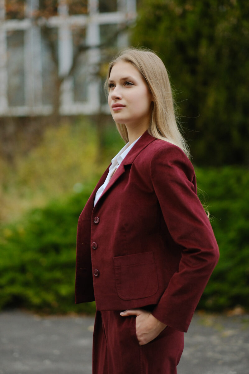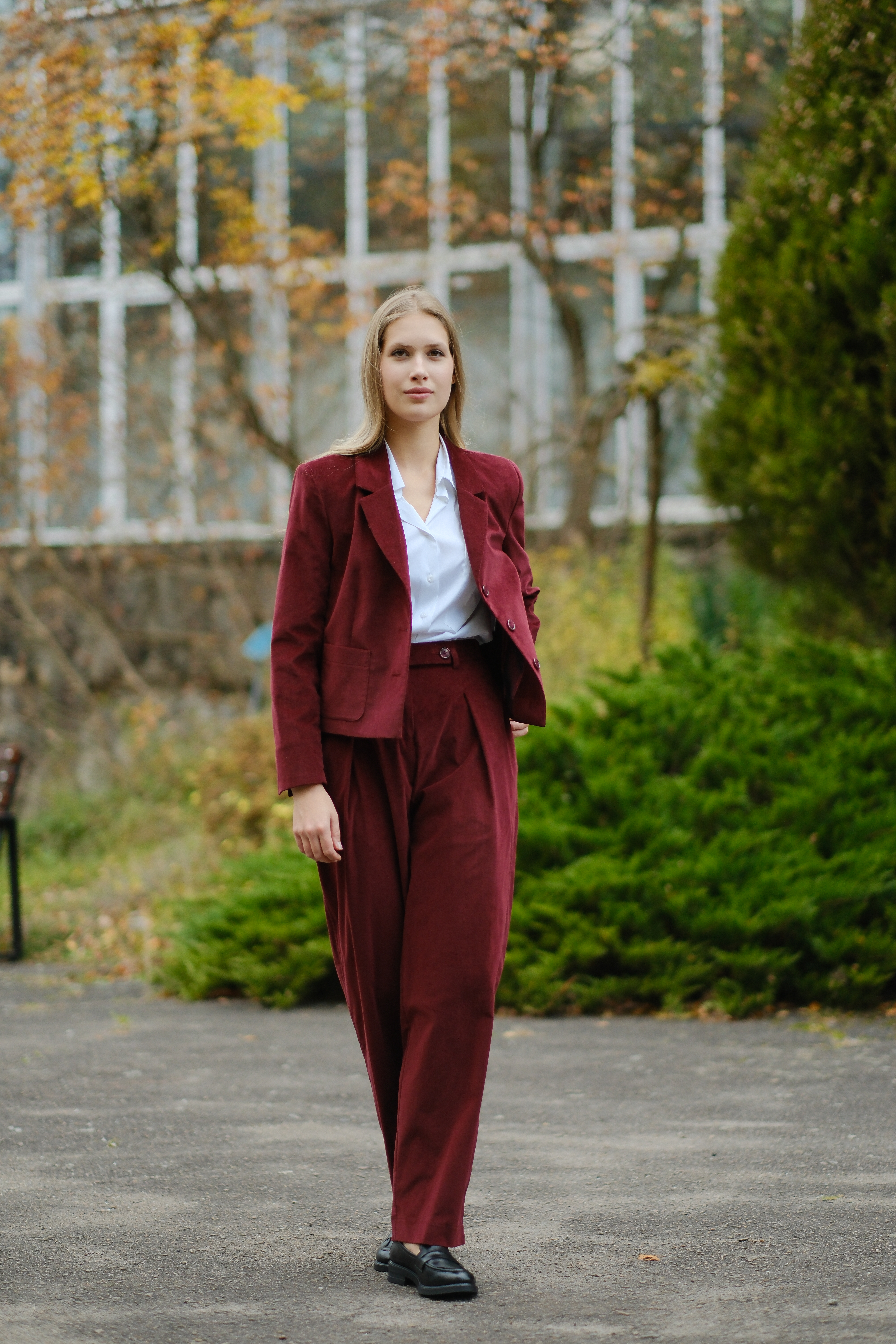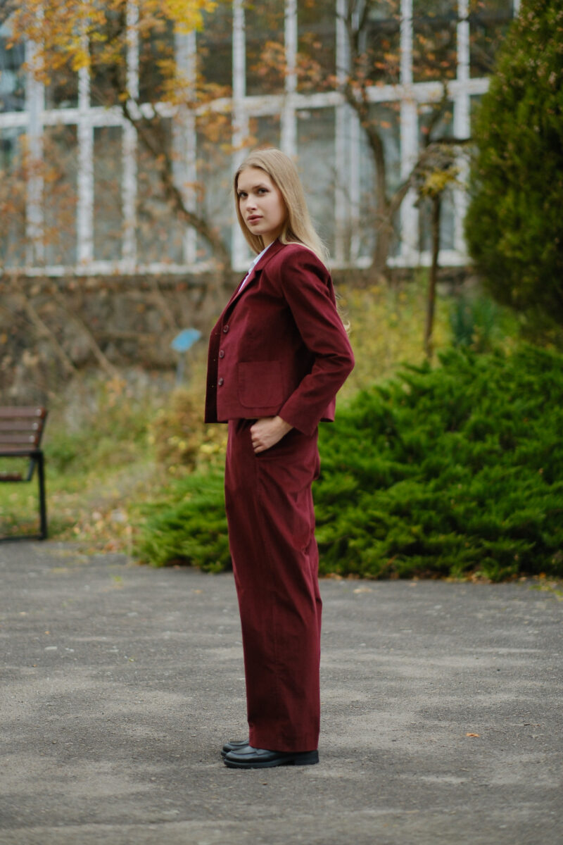 Рекомендовано тільки сухе чищення для збереження текстури вельвету та насиченого кольору. Прасувати з вивороту на низькій температурі або використовувати паровий режим. Дбайливий догляд дозволить зберегти цей костюм у бездоганному стані.
