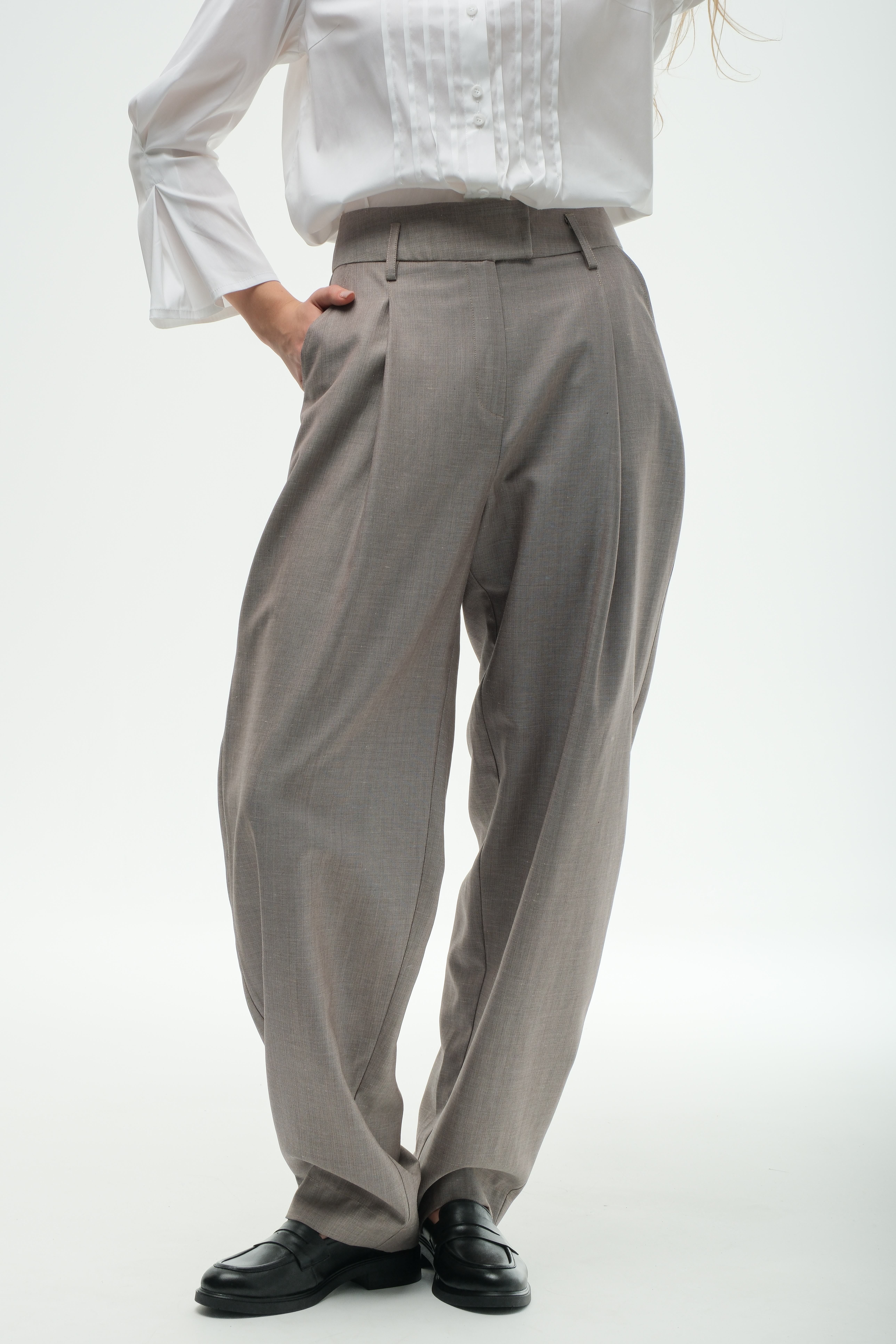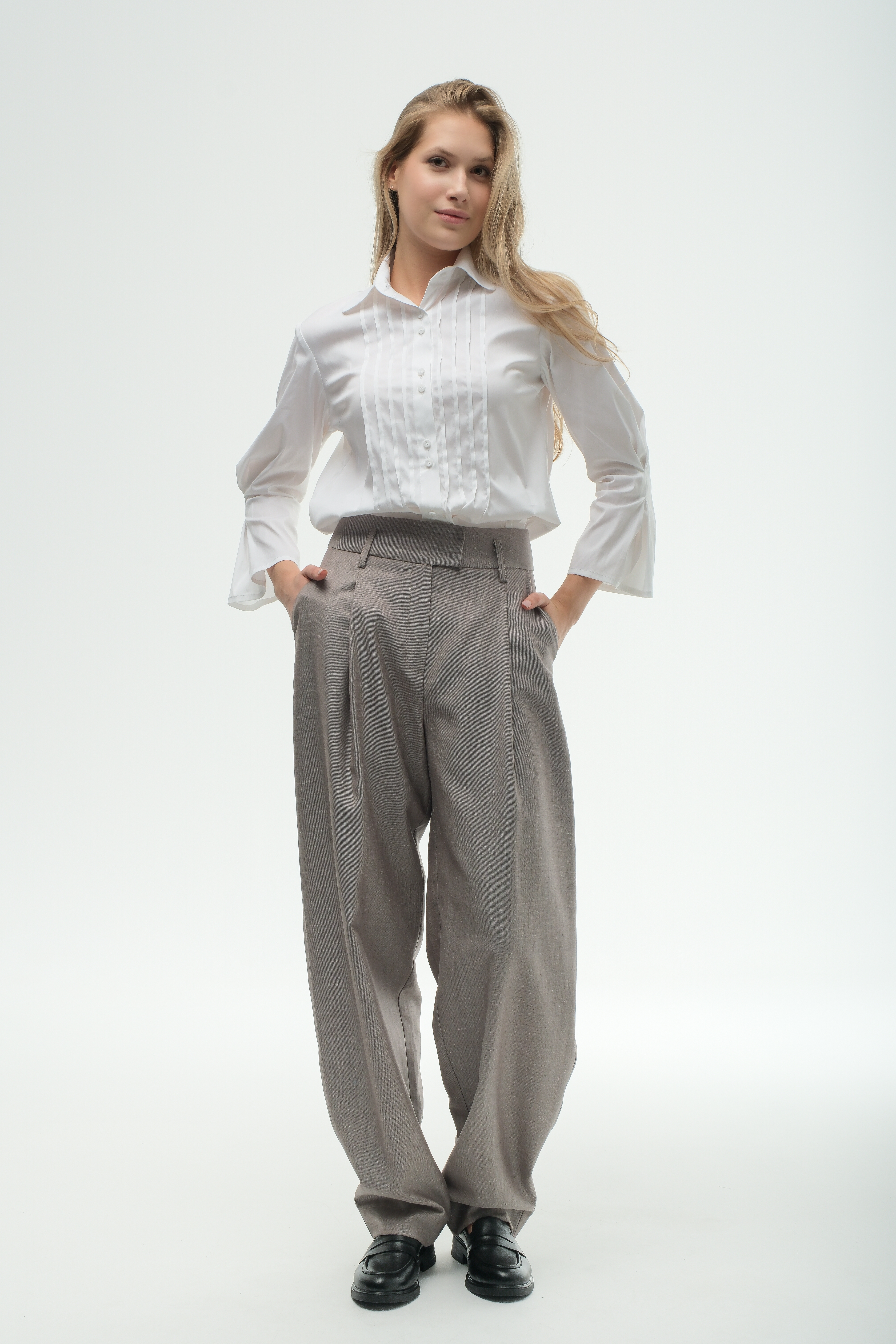 Брюки виконані з акцентом на новий пластичний крій: висока посадка та глибокі складки формують м’який об’єм, який природно рухається разом із тілом. Завдяки цьому силует виглядає вільним, але зібраним і витонченим.