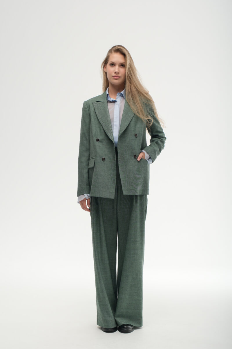 Зелений відтінок VIRELIS звучить стримано й сучасно — він асоціюється з балансом, внутрішньою зібраністю та близькістю до природи. Цей костюм легко адаптується до різних контекстів: від ділових зустрічей до неспішних міських днів.
